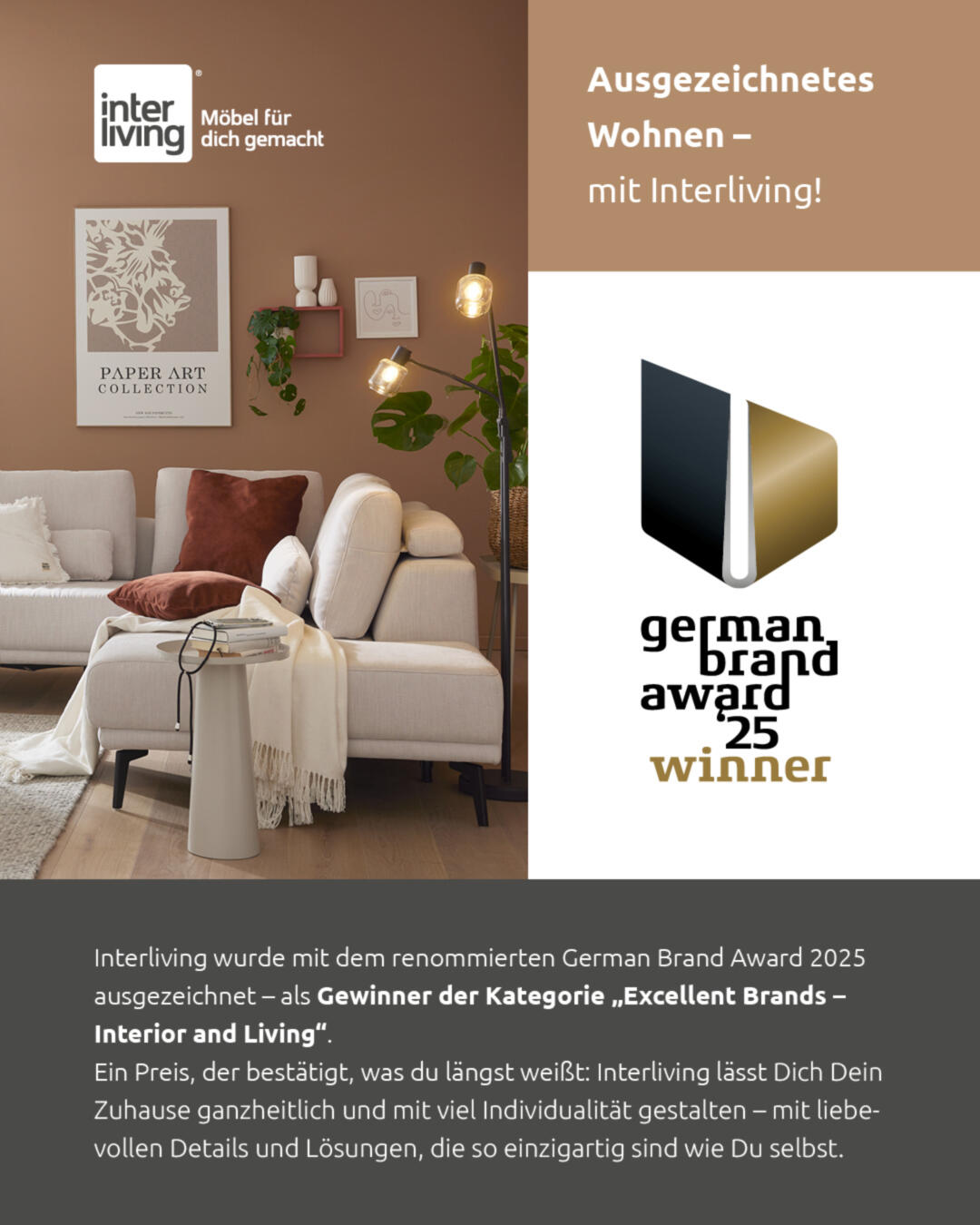 BBM freut sich, gemeinsam mit Interliving einen ganz besonderen Erfolg zu feiern: Interliving wurde mit dem renommierten German Brand Award 2025 ausgezeichnet – und das als Gewinner in der Kategorie „Excellent Brands – Interior and Living“. Diese Auszeichnung unterstreicht, was unsere Kundinnen und Kunden schon lange wissen: Interliving steht für hochwertiges Design, durchdachte Funktionalität und individuelle Wohnlösungen, die Ihr Zuhause zu etwas ganz Besonderem machen.